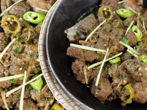 -In a bowl,add beef,ginger garlic paste,raw papaya paste,pink salt,lemon juice & mix well,cover & marinate for 30 minutes.