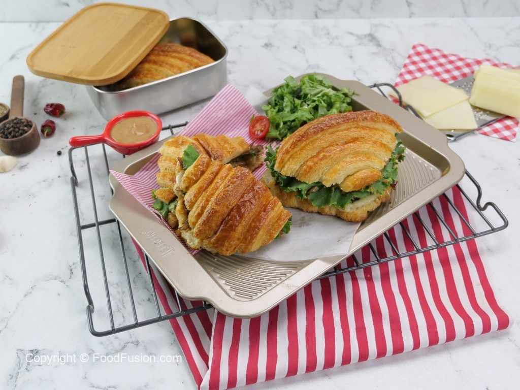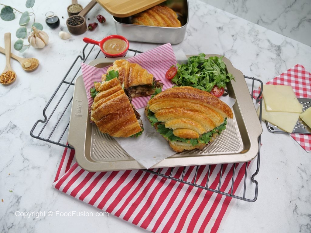 -Tayyar spicy bbq sauce ko top croissant per dal dein & flip ker ka sandwich tayyar ker lein (makes 3-4).