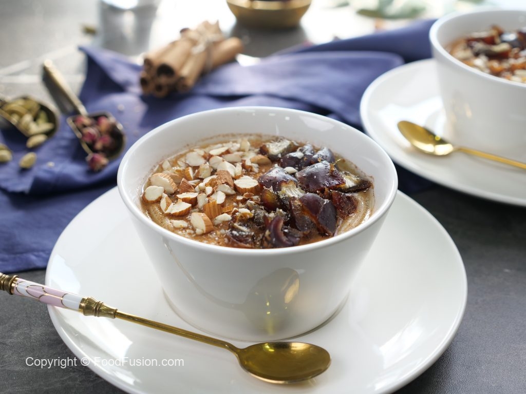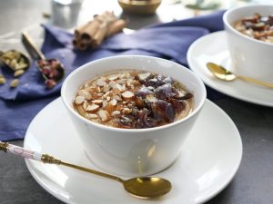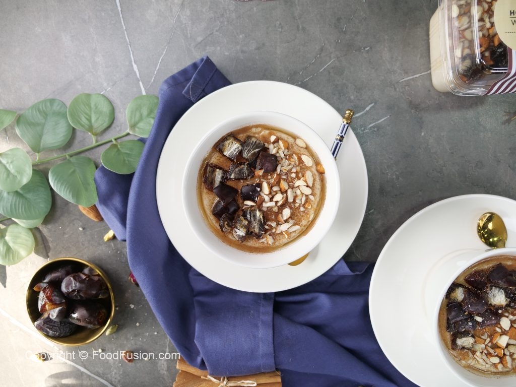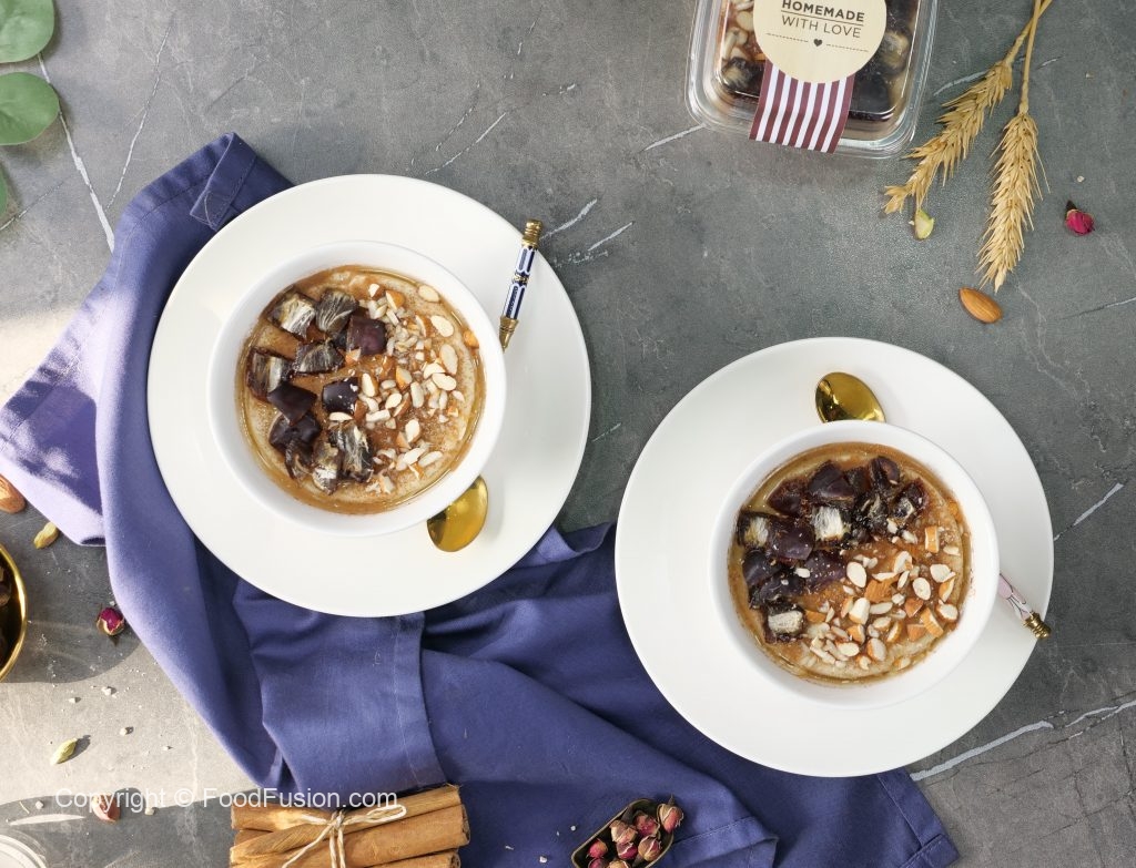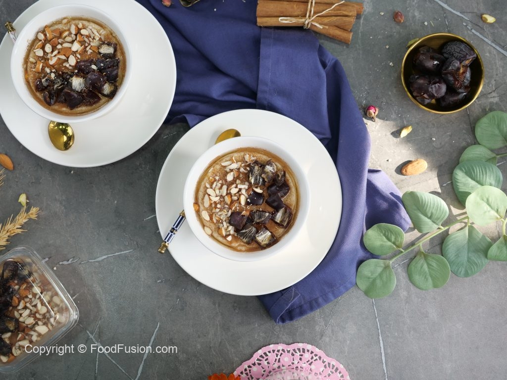 -In a serving bowl,ad prepared talbina,sprinkle cinnamon powder & garnish with honey,dates & almonds.