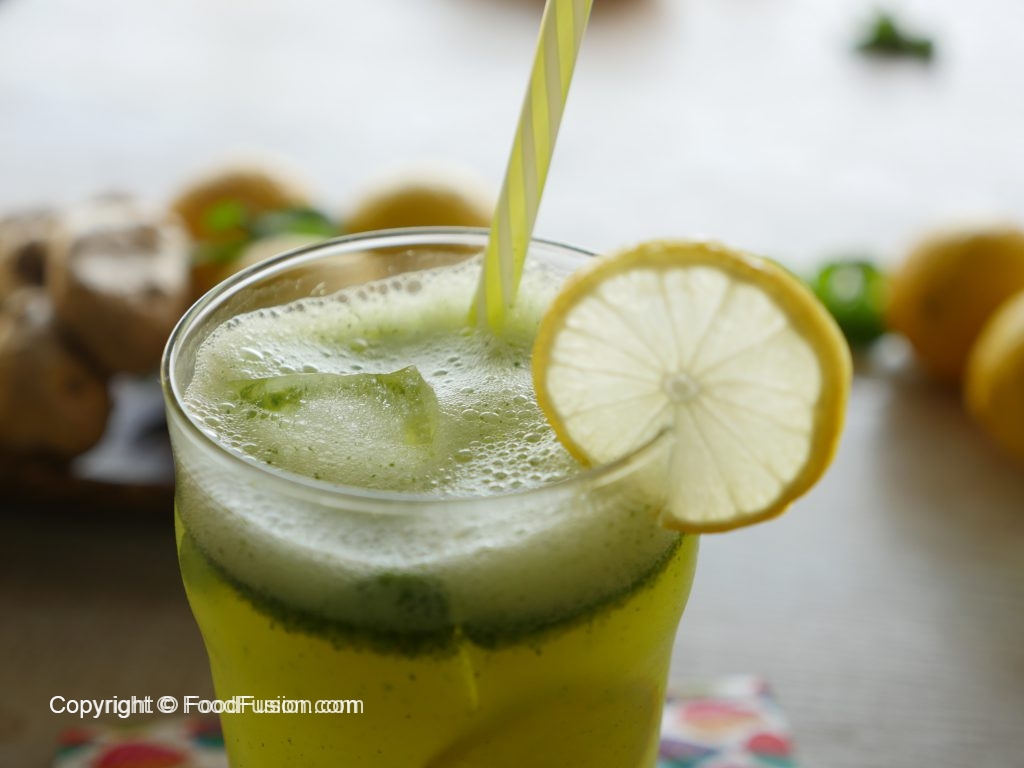 In blender,add ice cubes,lemon juice,prepared lemon green tea,honey,ginger,mint leaves and blend well.
