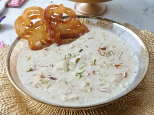 In a serving bowl,add rabri,sprinkle almonds,pistachios & refrigerate until chilled.