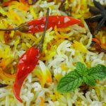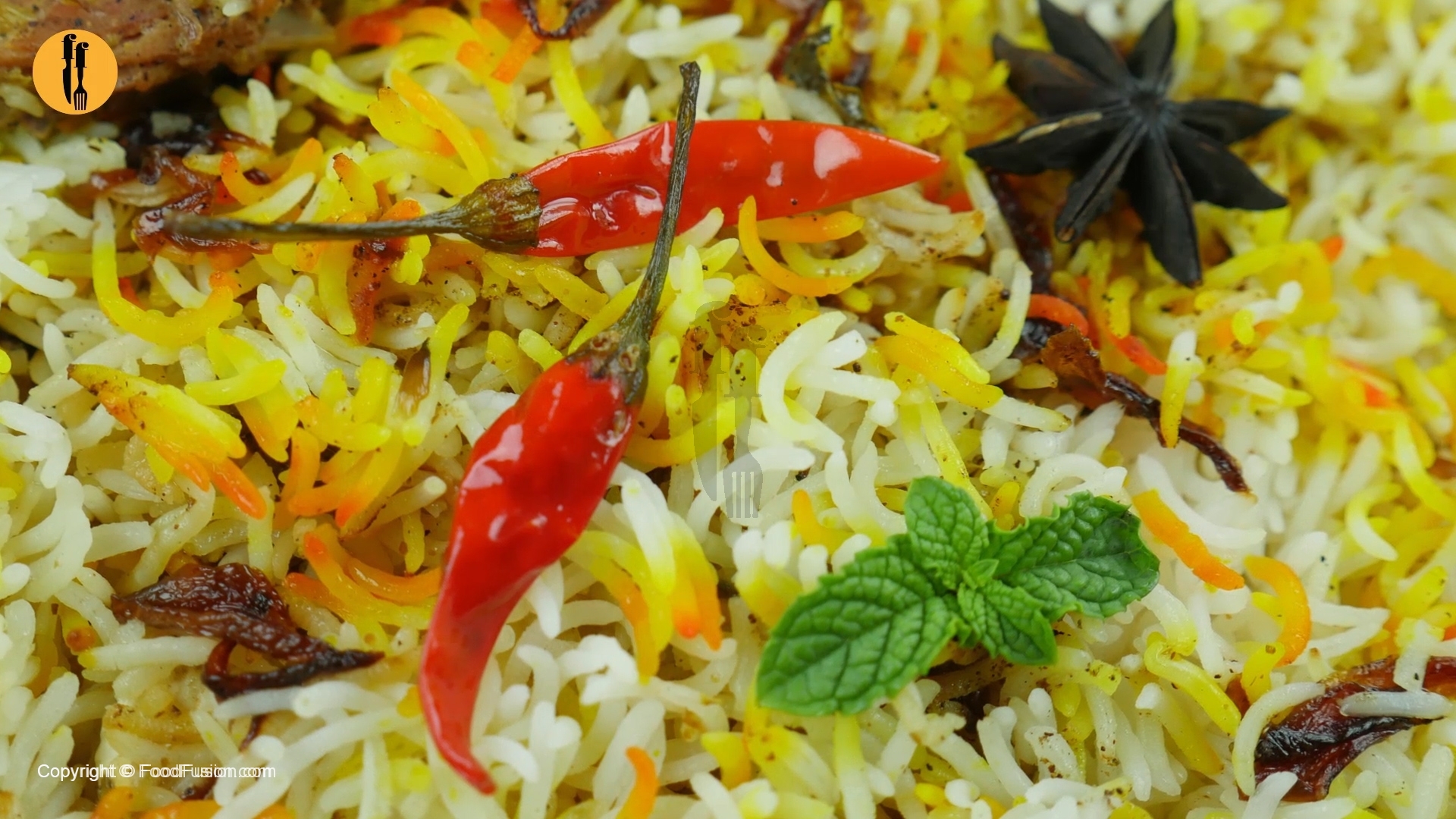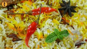 Boiled rice,ghee,garam masala powder,hari eliachi (grinded),jaifil & jawitri(grinded),zarda ka rang aur fried pyaz shamil karein.