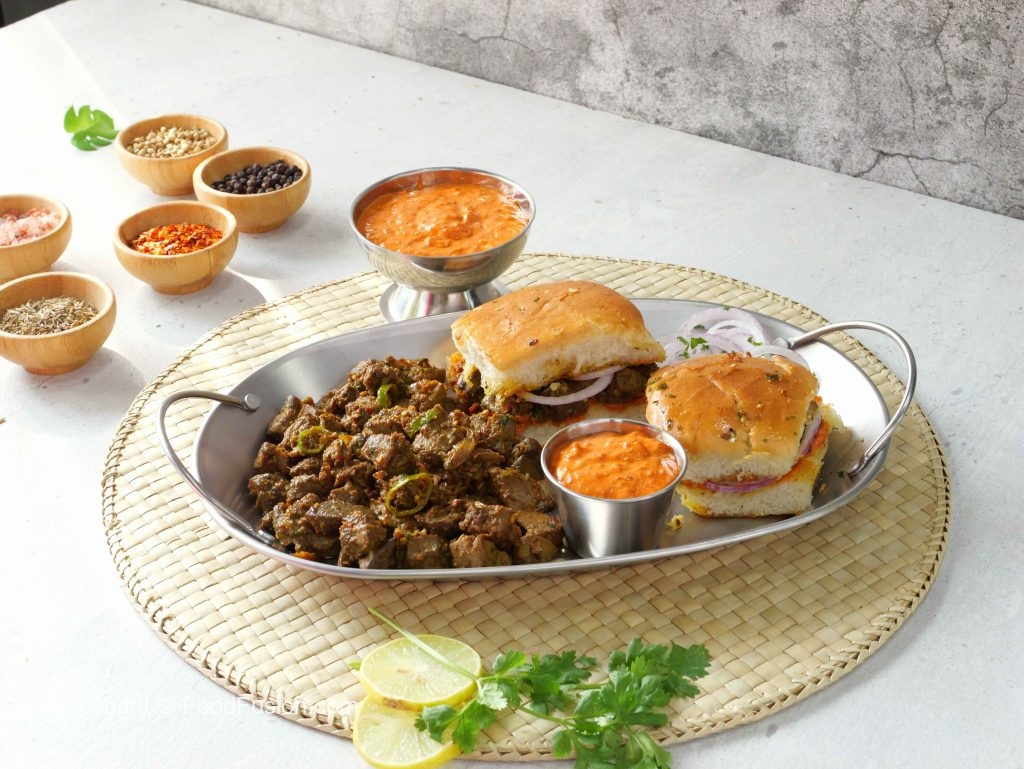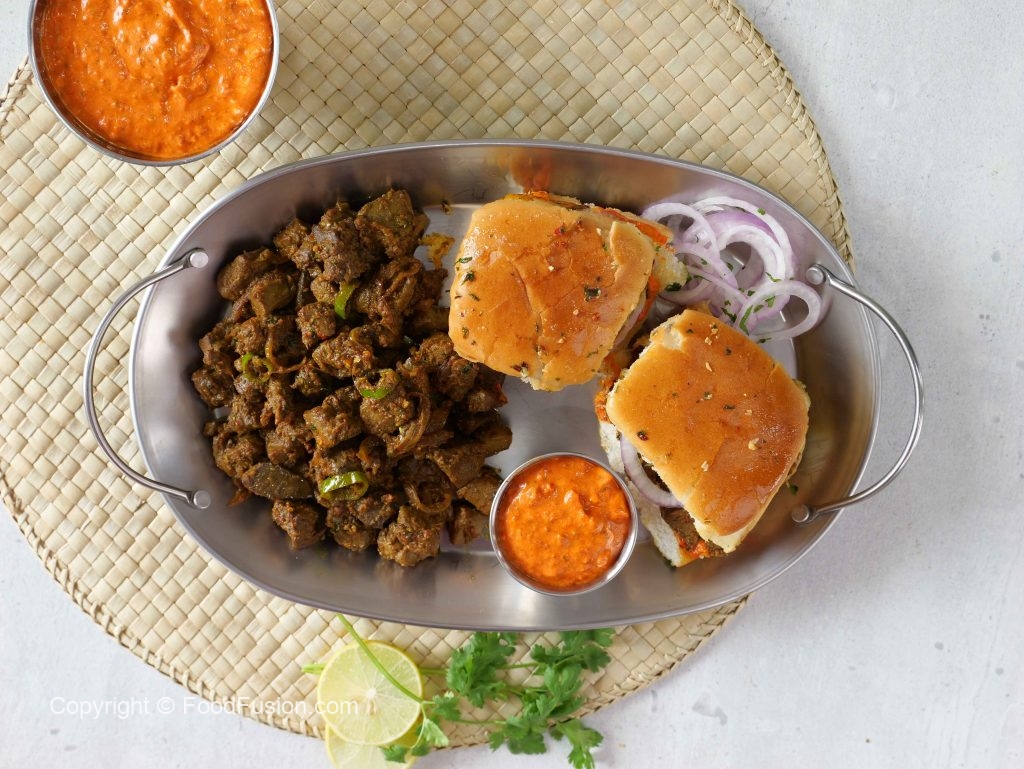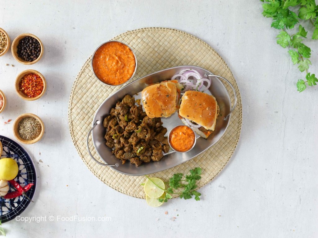 -Add & spread prepared chutney,prepared kaleji,onion rings & cover with top buns (makes 6).