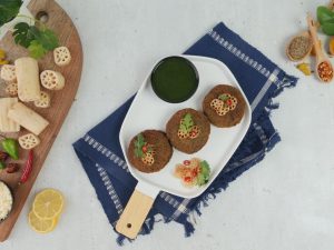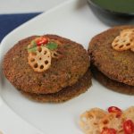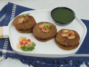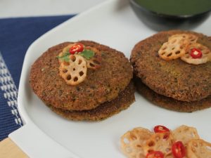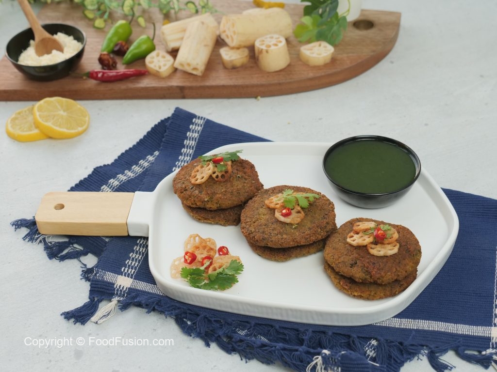 In a chopper,add lotus root,green chillies,mint leaves,fresh coriander & chop well.