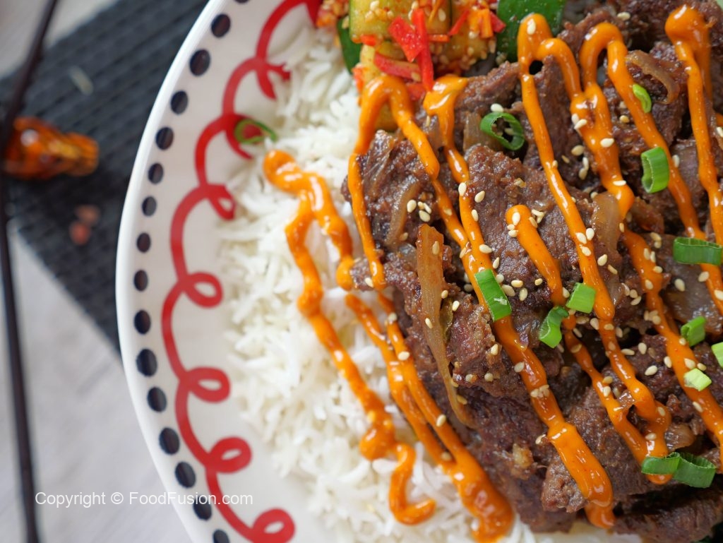 -Ek serving bowl mein cooked rice dalen, upar se beef bulgogi, steamed spinach, stir fried shiitake mushrooms, carrots, cucumber aur kimchi rakhen.