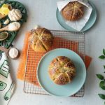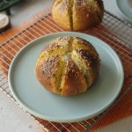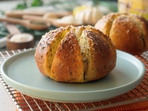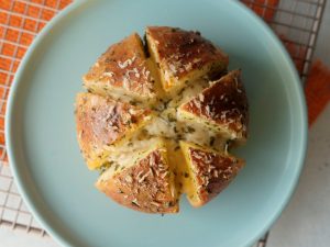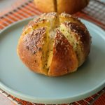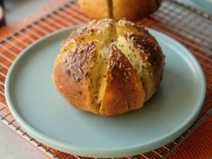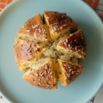 When the bread is cool enough to handle,cut each bread into 6 equal wedges (make sure to not completely cut through the bread and stay intact).