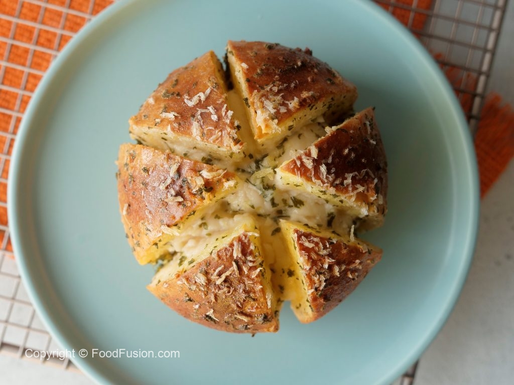 After the bread has been cut,pipe a rope of cream cheese filling in between each wedge and dip the entire bread into prepared garlic butter mixture.