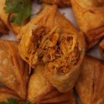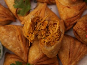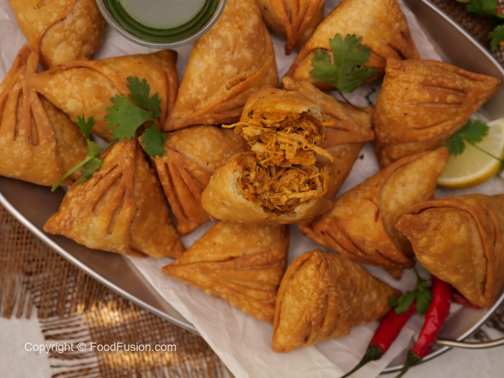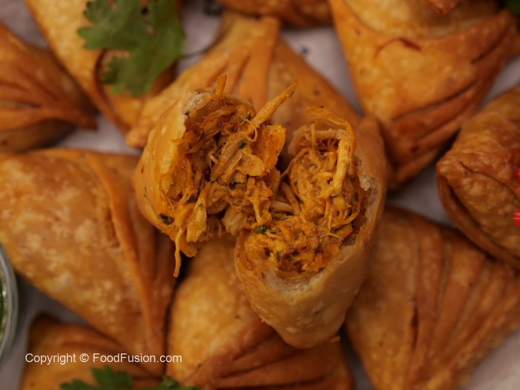 Place prepared chicken filling (1 tbs) at one side of triangle,join two corners & press gently to seal the joint & flip the cut side to make a samosa,press & seal the edges.