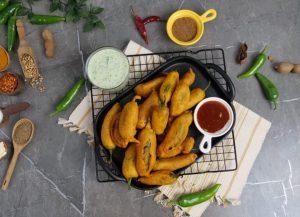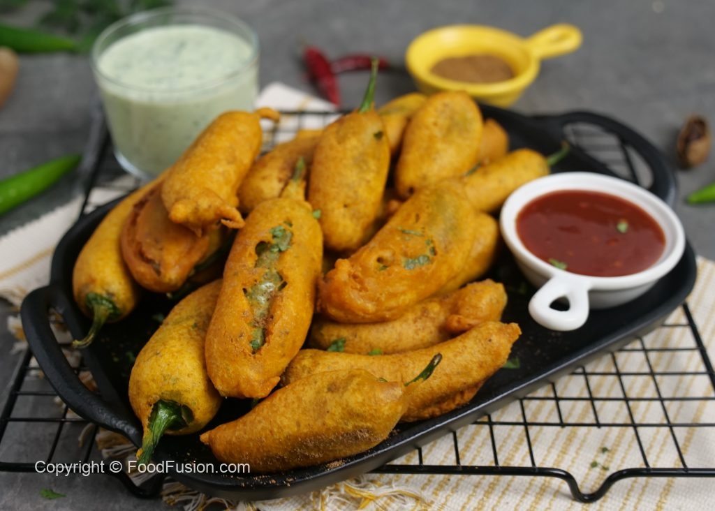 -Cut mirchi pakora from center and place them on a serving plate. Add green lentil gram in it.