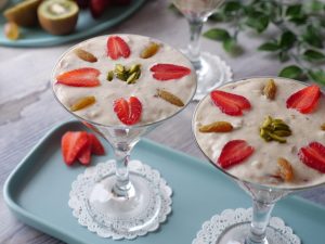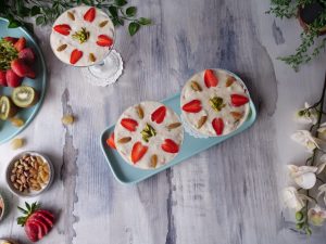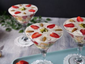 -Strawberry,kishmish aur pista sa garnish ker lein