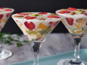 -In a serving glass,add mixed fruits,kiwi,papaya,strawberry,grapes & prepared firni.