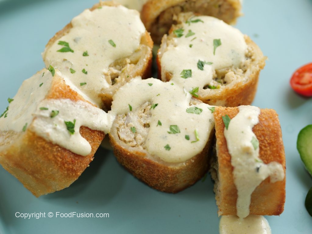 -Cut prepared malai chicken roll ups & drizzle prepared creamy sauce,sprinkle fresh coriander & serve (makes 4-5).