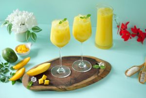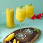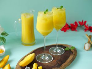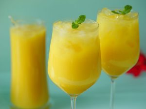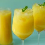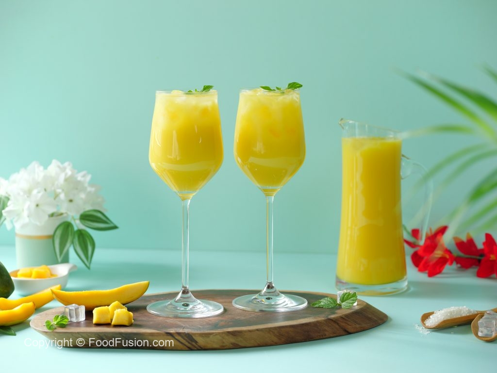 -Blending jug mein mango mixture,cheeni,lemon juice aur yellow food color dal ker ache tarhan blend ker lein phir stainer ki madad sa strain ker lein.
