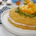 -Add & spread mango whipped cream & spread evenly then place another kunafa layer & pour warm sugar syrup.