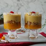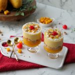 -Now add reserved mango puree,balushahi (crush with the help of hand),prepared mango rabri, mango chunks & garnish with cream,pistachios,almonds,cherry & serve chilled!