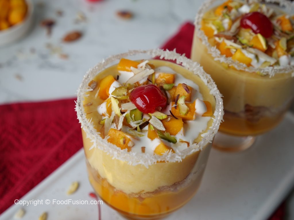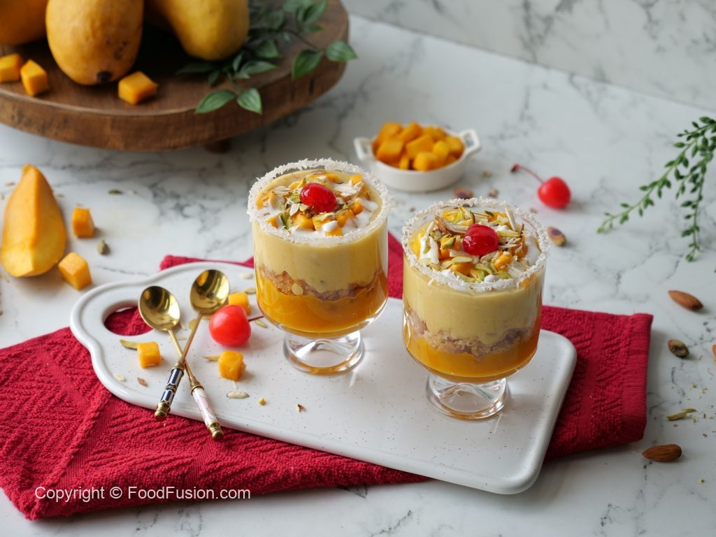 -Reserved mango puree,balushahi (crush with the help of hand),tayyar mango rabri & mango chunks dal dein,cream,pista,badam aur cheery sa garnish ker ka thanda serve karein!