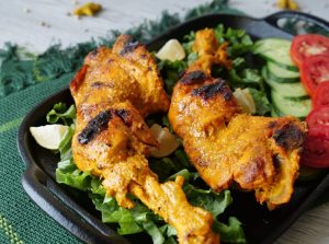 In a bowl,add yogurt,ginger garlic paste,red chilli powder,coriander powder,turmeric powder,cumin powder,salt,garam masala powder,yellow food color,lemon juice & whisk well.