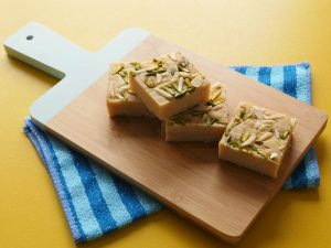 Mould mein cooked khoya/mawa dal ker evenly spread ker lein.