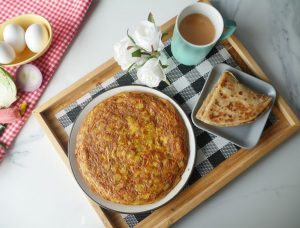 In frying pan,add cooking oil,egg omelet mixture and spread evenly,cover and cook on low flame for 5-6 minutes then flip and cook for 2-3 minutes & serve!