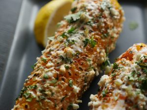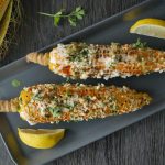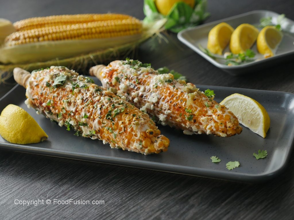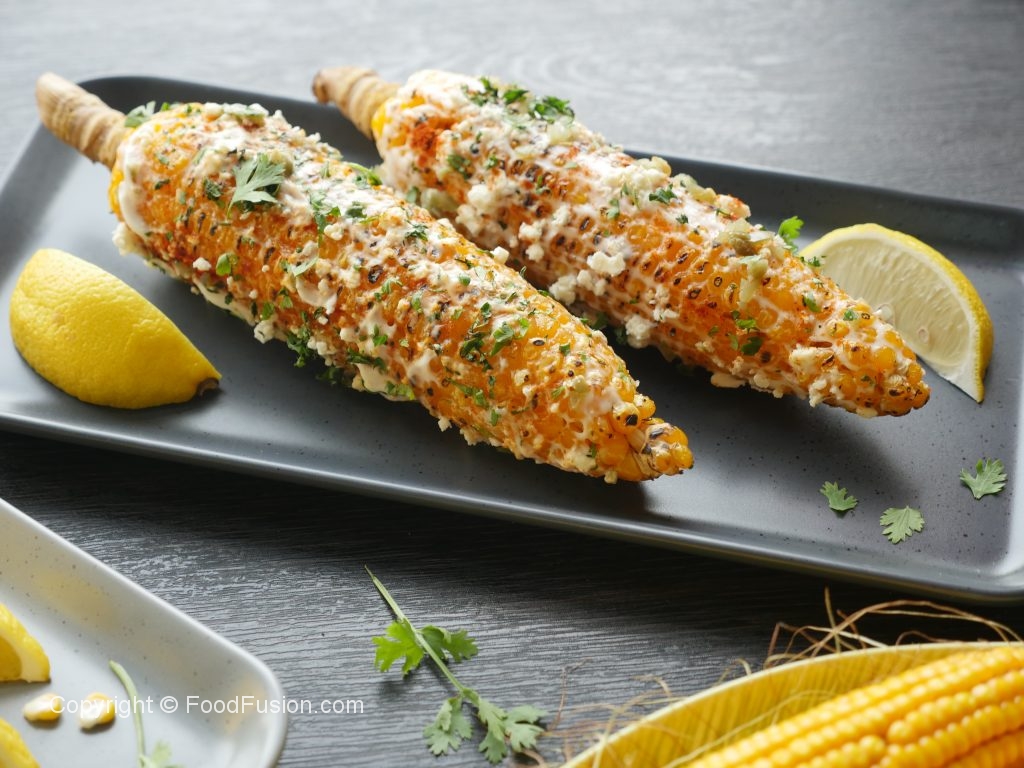Brush corn with mayonnaise+ cream,spinkle feta cheese,red chili powder,paprika powder,jalapenos, fresh coriander and squeeze lemon juice.