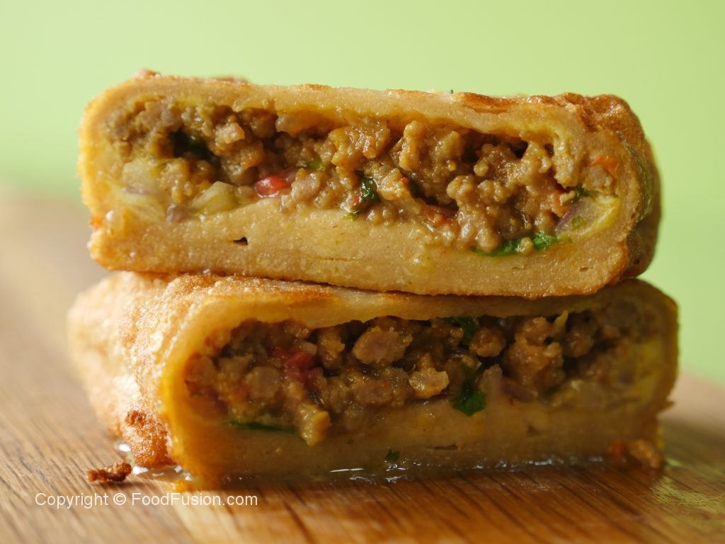 Cooked qeema aur anday ka mixture dal dein aur tamam edges ko fold ker ka anday sa seal ker lein (makes 4-5).