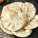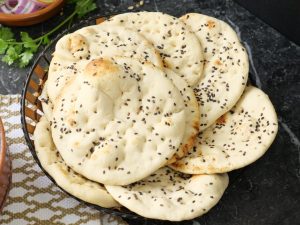 On heated iron griddle (inverted/straight),place naan (wet side down) & cook on low flame until it starts to bubble and bottom has browned then flip griddle and cook top side on direct flame until it’s charred (makes 12-13).