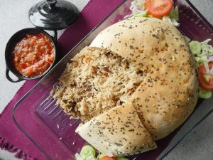 Fried pyaz dal ker dough ka edges ko fold ker ka oil sa grease ker lein aur baking tray (10x10 inches) per flip ker lein.