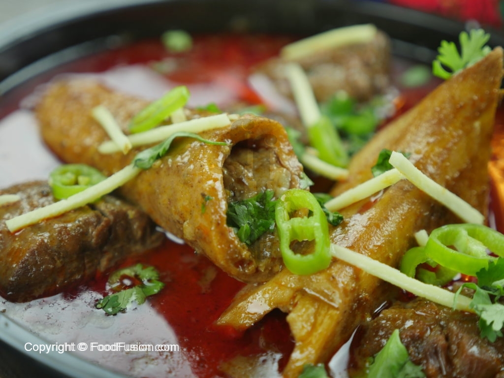 To serve, add nihari in a bowl, pour tarri, garnish with julienne cut ginger, chopped green chilies, lemon and chopped coriander.