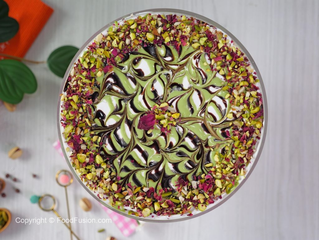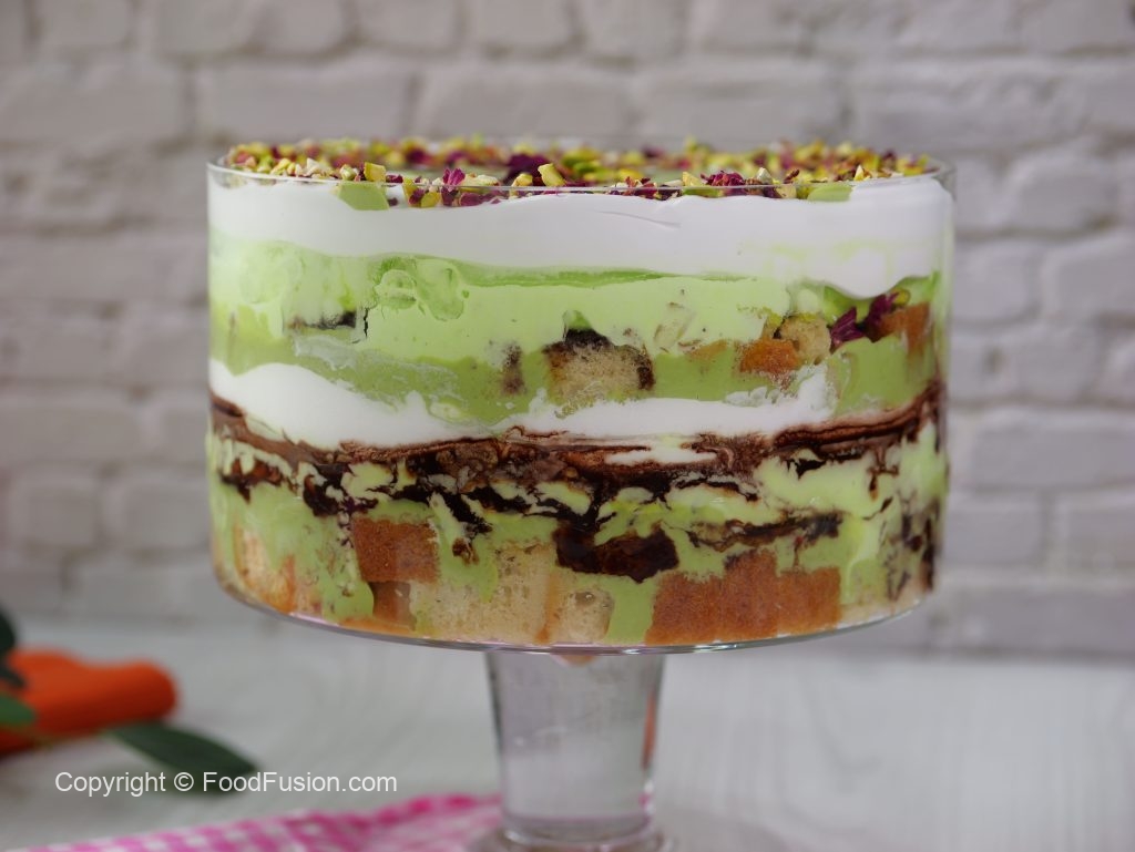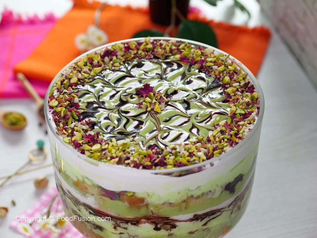 -Trifle bowl mein sabse pehle plain cake dal kar spread karein,phir sugar syrup,chocolate syrup,pista sauce,dried rose petals,pistachios,almonds aur ice cream slices daal kar layer banayein.