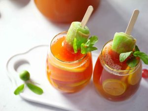 -In a jug,add ice cubes,prepared lemonade,peach,red grapes,apple,lemon,orange juice,pineapple juice, sparkling water,omore traffic light & mix well.