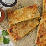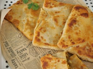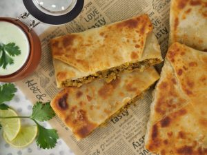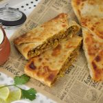 -On rolled dough,add prepared filling,fold one side & apply flour slurry then fold & apply flour slurry & make a square shape paratha.