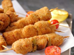 -Coat chicken skewers in all-purpose flour then dip in whisked eggs & coat with breadcrumbs (makes 14-15).