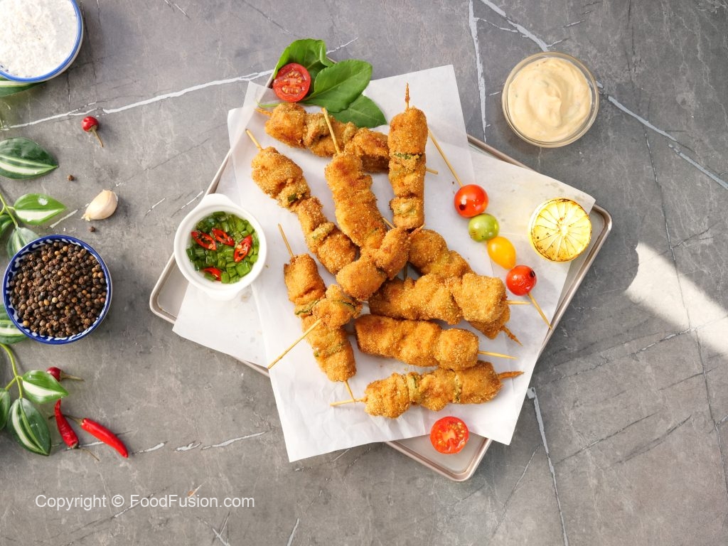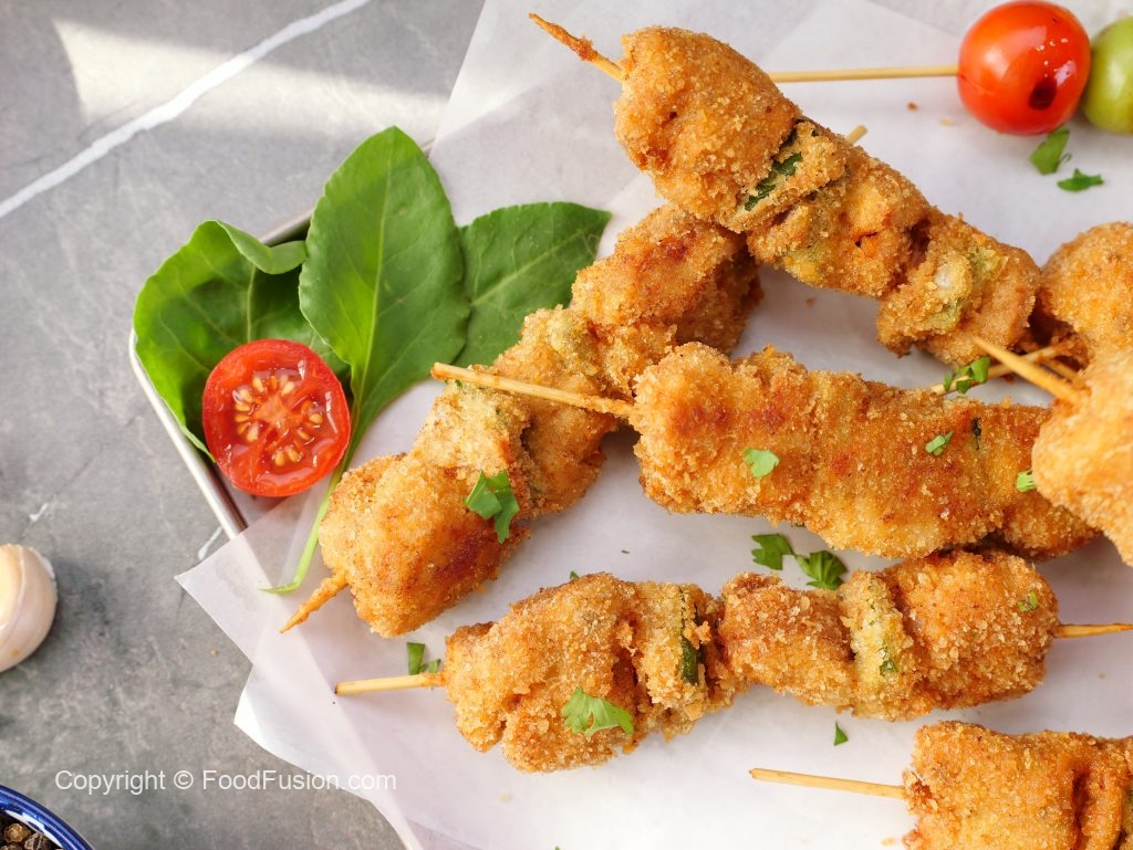 -In a wok,heat cooking oil & fry chicken skewers on low flame until golden & crispy.