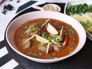In serving dish,add nihari,cilli oil (tarri),ginger,green chilli,fresh coriander,lemon & serve!