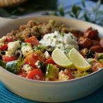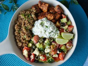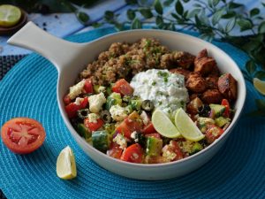On a serving dish,add quinoa,greek salad,prepared chicken & tzatziki sauce.
