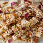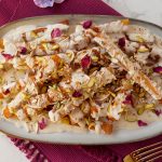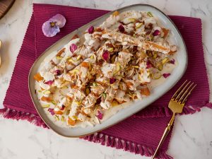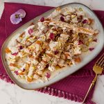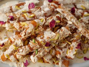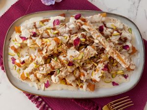 On serving plate,add fried bread sticks,pour sugar syrup,milk syrup,almonds & pistachio.