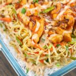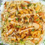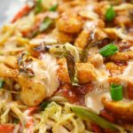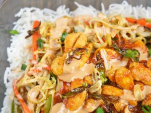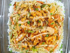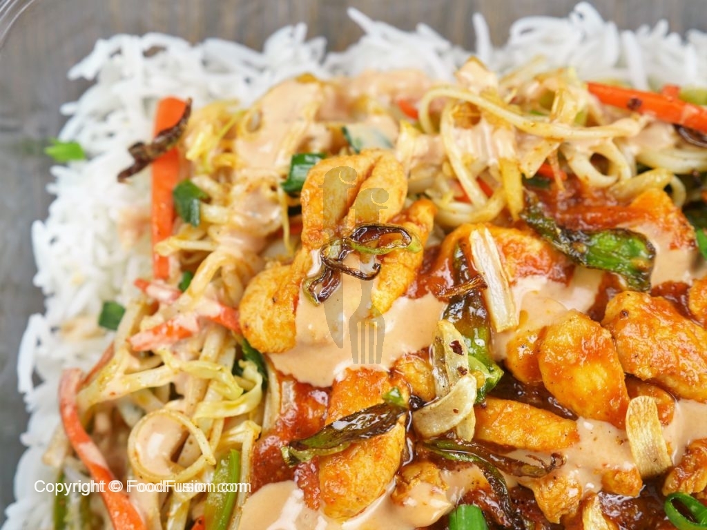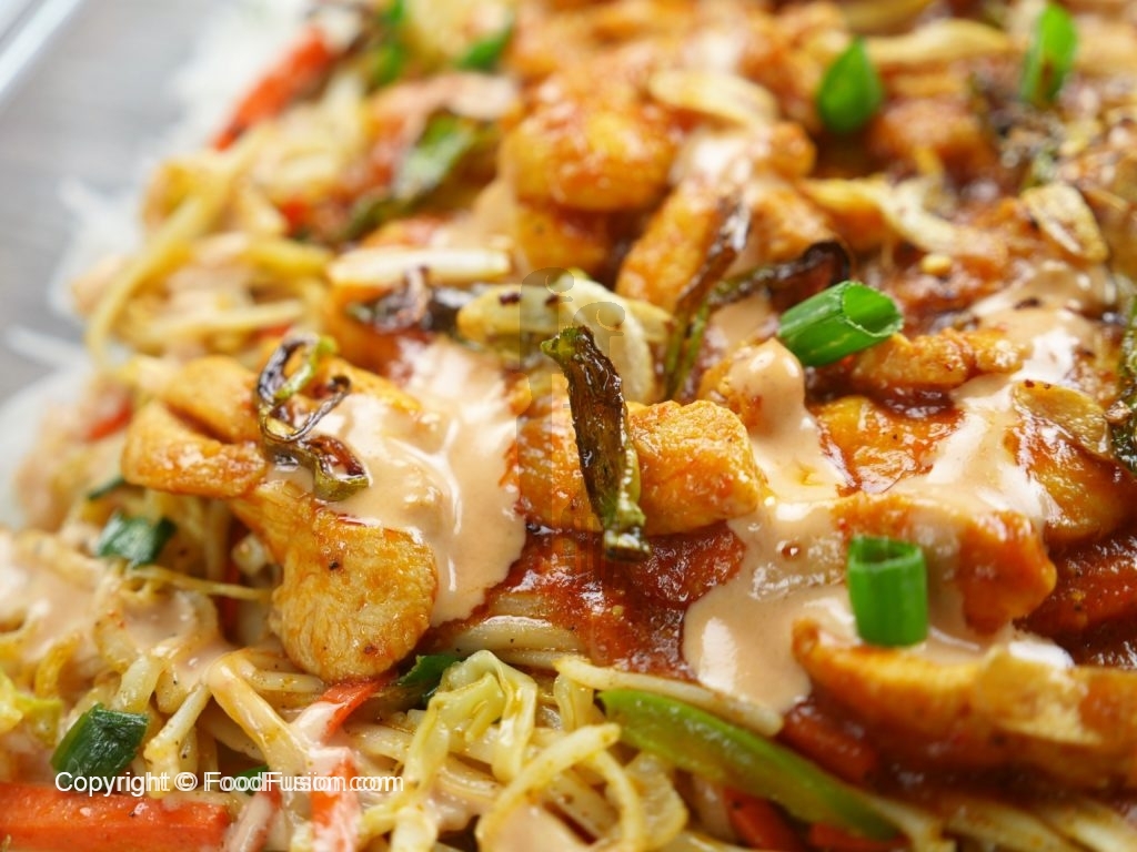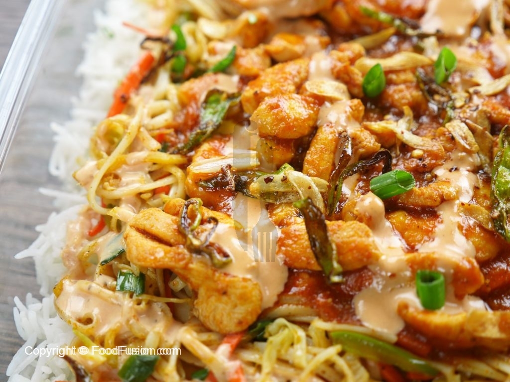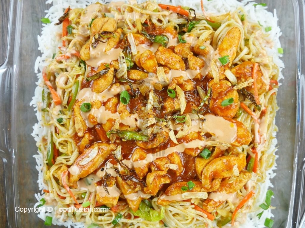 In a serving dish, spread a layer of rice on the dish. Add second layer of stir fried vegetables with noodles, than third layer of chicken gravy. Add mayo sauce and fried garlic and green chilies as top layer