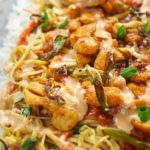 In the same pan, add oil and all vegetables except green onion’s green. Add soya sauce, salt, black pepper, red chili and stir fry for 1-2 mins. Add boiled egg noodles and toss. Add sesame oil and green onions’ green. Toss well and dish out in a bowl and set aside.
