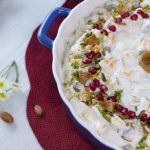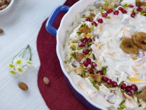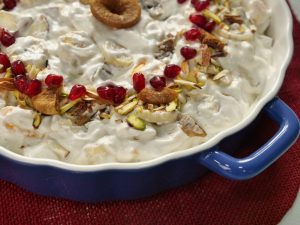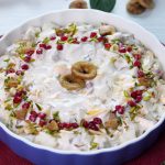 -In a serving dish,add prepared cream fruit chaat & garnish with pistachios,almonds,fig,pomegranate,fig & serve!
