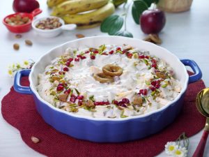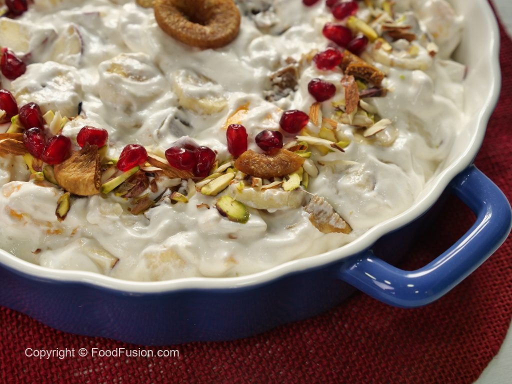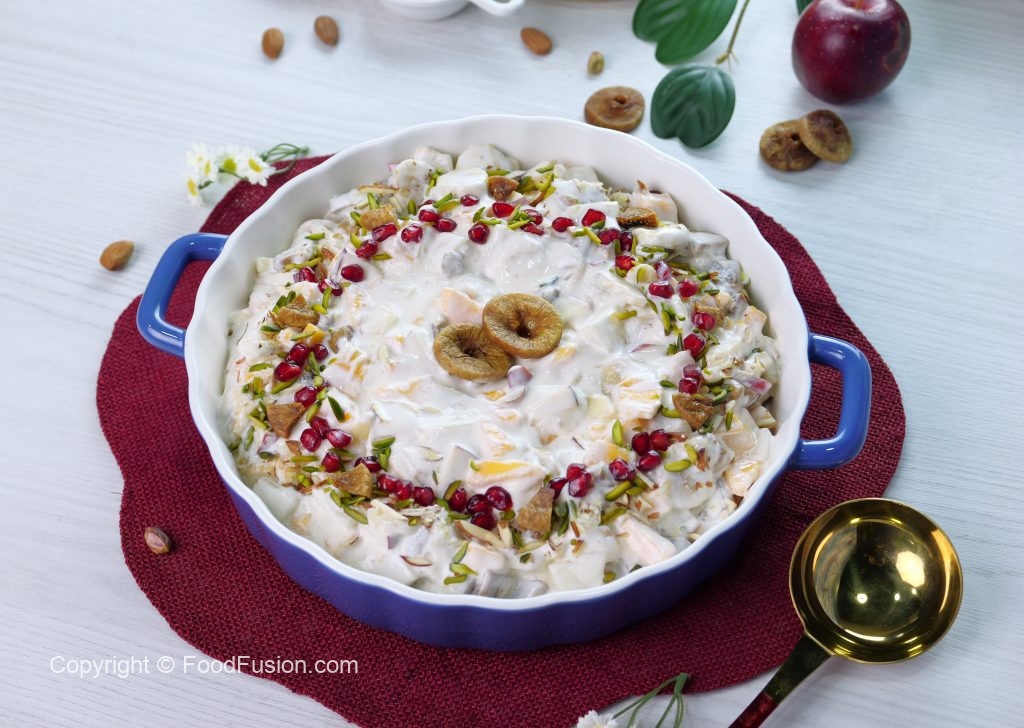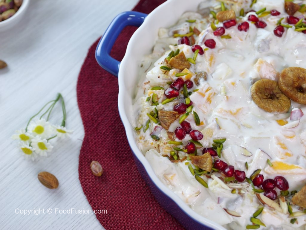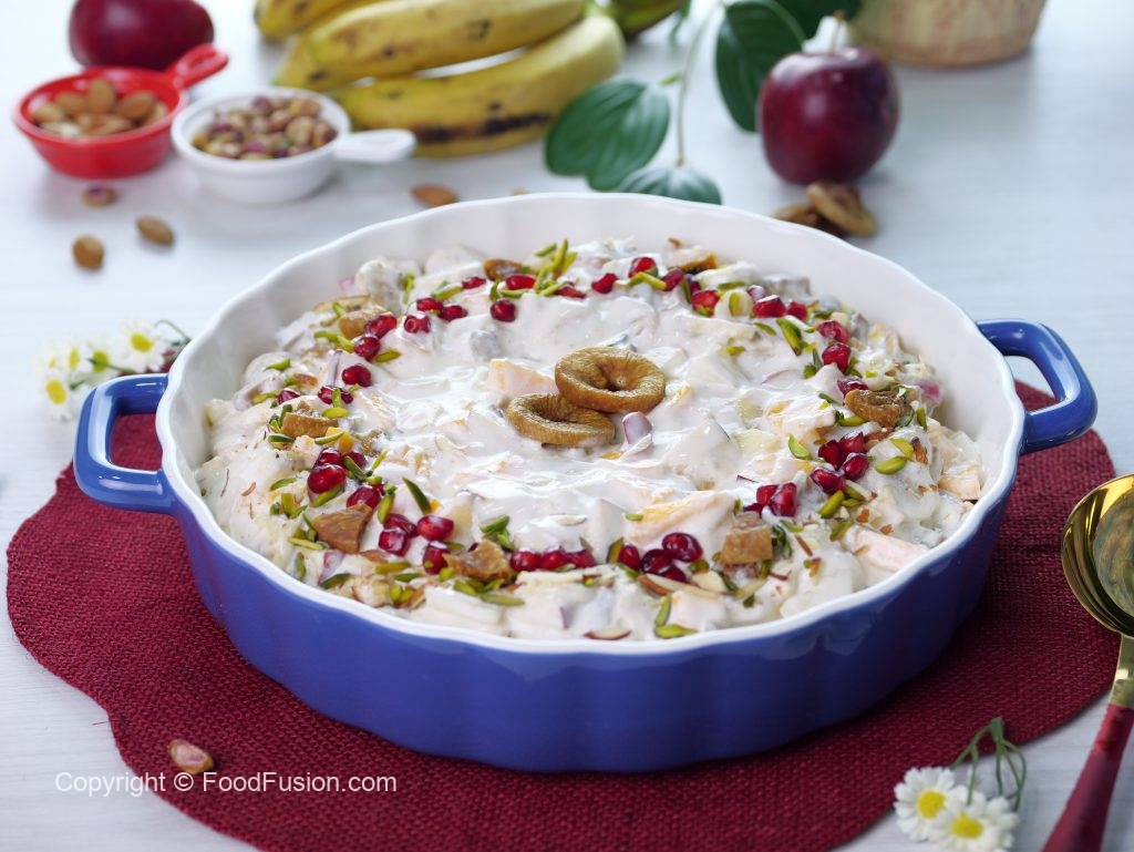 -Papaya,banana,cheeku,melon,apple,pista,badam aur injeer dal ker ache tarhan mix ker lein.