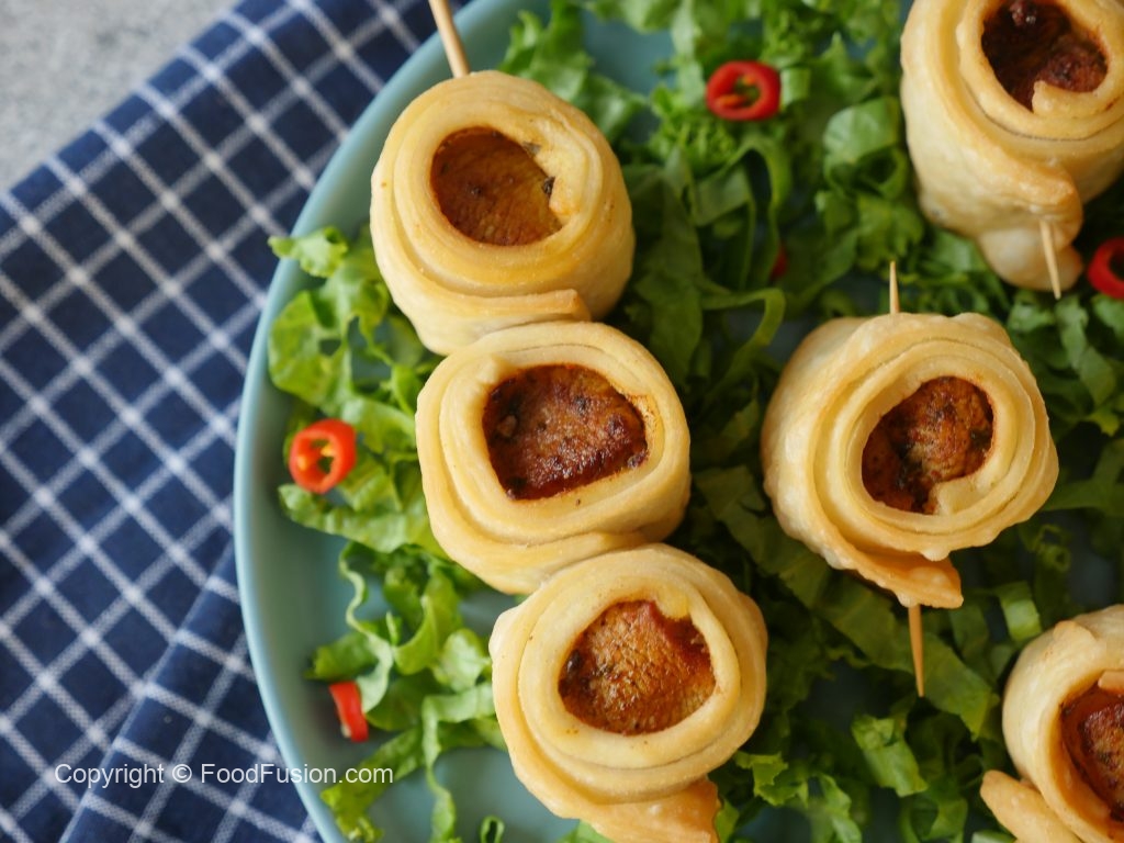 Cut into long strips,take one strip,place one chicken boneless cube and roll it then thread into skewers.