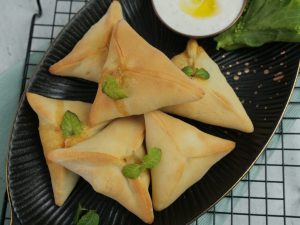 -Chota rolled dough lein,1 tbs spinach & walnut filling aur feta cheese dal dein aur edges per pani laga lein.