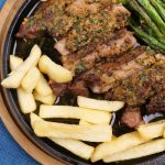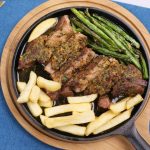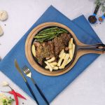 -Add seasoned steak piece,press with patty press to lock the juices,flip,repeat the process & cook on medium flame from both sides until done,rest it for 2 minutes then cut into pieces.