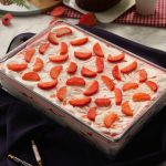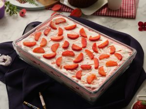 In a serving dish,add & spread strawberry cream,layer ladyfinger biscuits on top then cover with a layer of olper’s whipped cream (reserved) & spread evenly.
