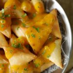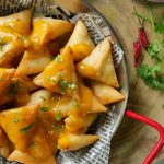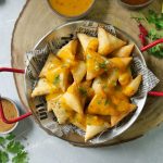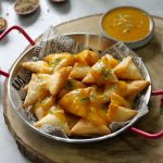-Cut samosa sheet,make a pocket,add prepared potato filling (1 tsp) & roll into the shape of samosa and seal corners with all-purpose flour slurry & reserve remaining potato mixture for chutney.