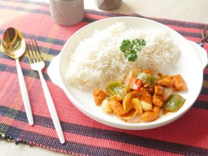 Cut chicken fillets into cubes & set aside.