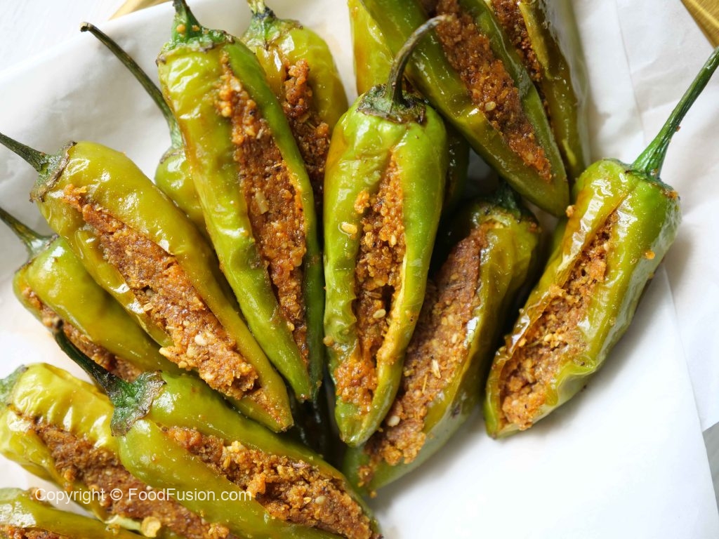 -In frying pan,add heat cooking oil & fry stuffed chillies on medium flame for 2 minutes,turn sides & add water,cover & cook on medium flame for 4-5 minutes (makes 15-20).
