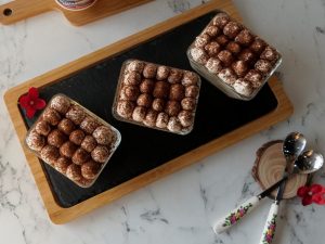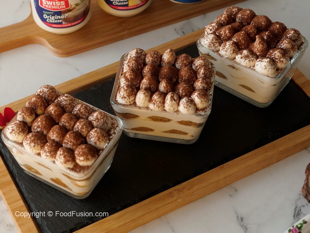 In serving cups,add a layer of prepared cheese & cream mixture,add coffee dipped biscuits one by one and add another layer of cheese & cream mixture,sprinkle cocoa powder on top.