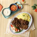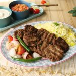 -Kofta kebab ko saffron butter rice,grilled vegetables & tahini yogurt sauce ka saath serve karein.