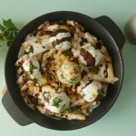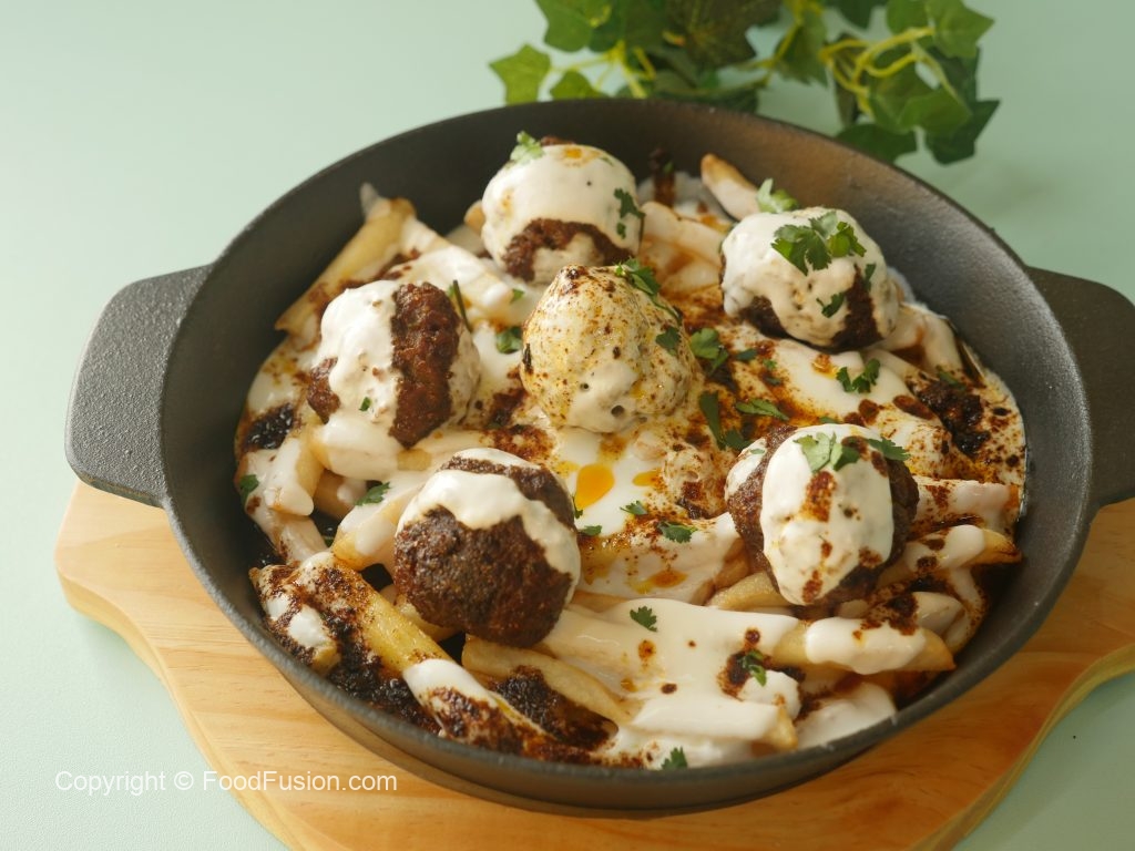 On serving dish,add potato fries,cooked meat balls,garlic yogurt,pour heated meatballs oil,fresh coriander & serve!